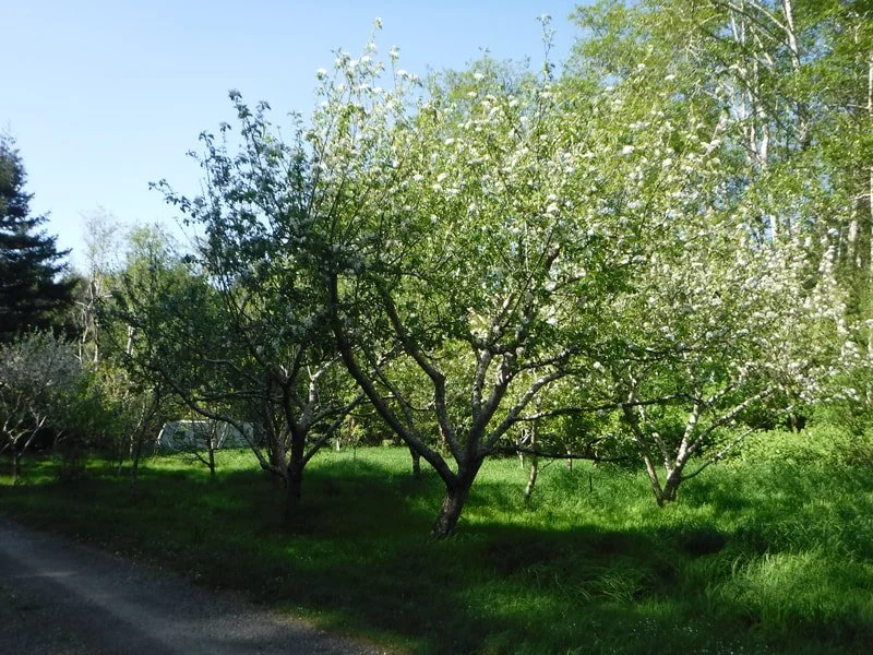 Orchard in spring [trailer no longer there—an artist stayed for about a year, but she’s moved on]
